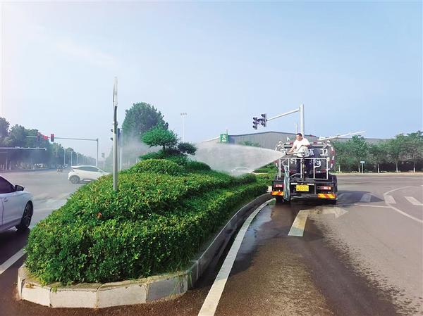 7月24日,鹿邑县园林工人给路旁的绿植浇水。入夏以来,由于高温少雨,绿植出现不同程度的旱情。为确保绿植健康生长,该县城市绿地建设中心工作人员迎高温、战酷暑,全力以赴开展抗旱保绿工作。记者 侯国防 摄