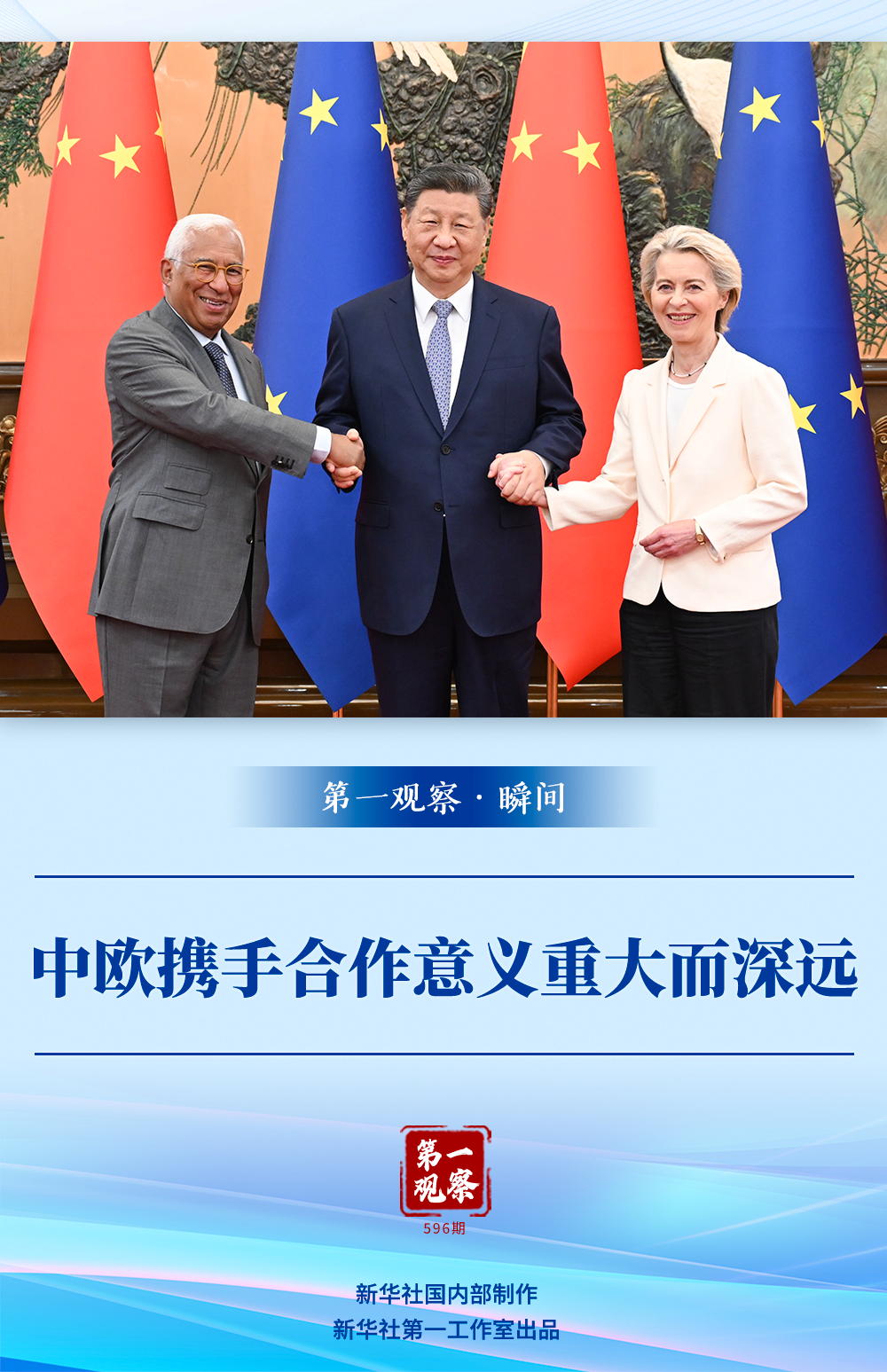 会见开始前的合影环节,科斯塔主席、冯德莱恩主席主动向习近平主席伸出右手,三位领导人微笑着携手面向记者合影留念。