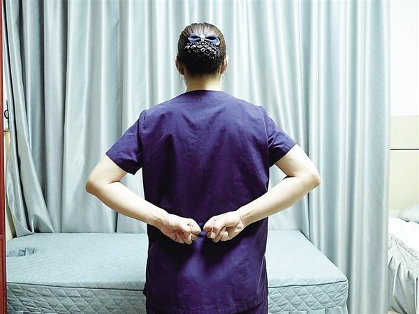 两脚分开站立,双手向后伸展,手心朝外,轻轻握拳;将双拳置于腰骶部,自下向上轻轻敲击,同时身体逐渐向前俯身;头部向左后方转动,保持敲击动作;头部转回正前方,同时双拳改为自上而下敲击,逐渐起身。此动作对应人体的肺脏,可激发身体背部阳气,增强肺呼吸功能的通畅性。