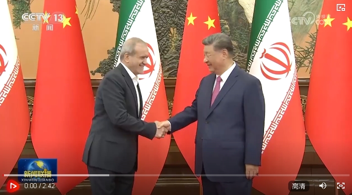 习近平指出,中伊关系经受住国际风云变幻考验,保持平稳健康发展。去年我们在喀山会晤后,两国各部门积极落实双方达成的重要共识,中伊各领域合作取得不少新成果。中方始终把发展对伊关系置于中国中东外交重要位置,愿同伊方赓续友好,深化互信,加强在贸易、投资、清洁能源、互联互通等领域合作,增进人文交往,携手推动中伊全面战略伙伴关系行稳致远。中方提出全球治理倡议,愿同包括伊朗在内的国际社会一道,推动构建更加公正合理的全球治理体系,携手构建人类命运共同体。
