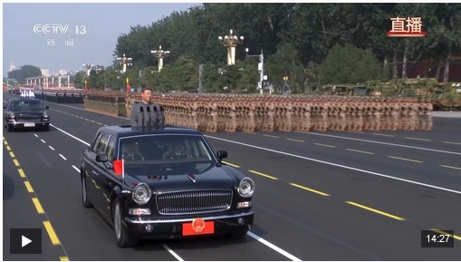 在雄壮的军乐声中,习近平乘车沿着宽阔的长安街,依次检阅徒步方队和装备方队。