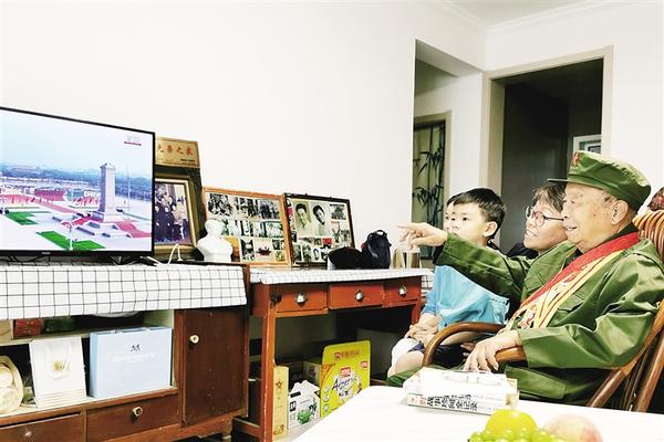 左图:9月3日上午,在淮阳区柳湖街道南花园小区,97岁的抗战老兵吴振豫与家人一同观看纪念中国人民抗日战争暨世界反法西斯战争胜利80周年大会直播。 记者 杜欣 摄