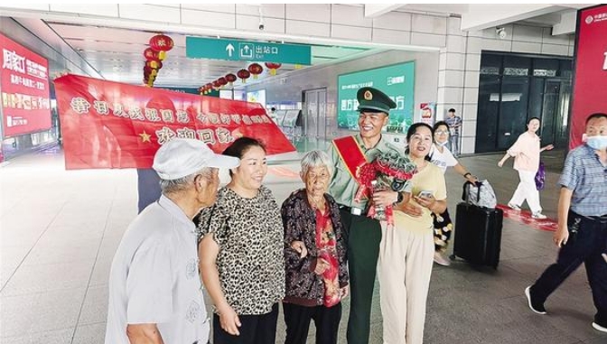 9月4日,在高铁周口东站出站口,市民们早早守候,手拉横幅,眼里闪着期待的泪光,迎接从部队退役的亲人。横幅上的每一个字,都是家人最深沉的爱与最由衷的敬佩:“昔日从戎报国志,今朝卸甲创辉煌。”