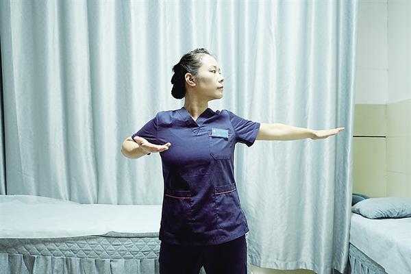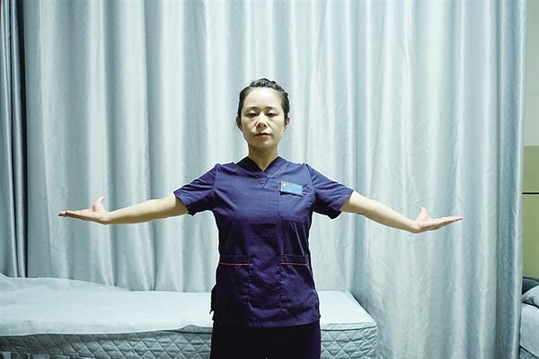 双臂自胸前平行展开,夹紧背部,以大拇指为导引,手臂从前向后旋转至极限位置,感受手臂内外侧的拉伸感。动作配合呼吸:吸气时向后旋转伸展,呼气时放松回位。该动作通过刺激心俞穴、肺俞穴和手臂上的心经、肺经等经络,有助于提高心肺功能。(周口市中医院 张珂畅)
