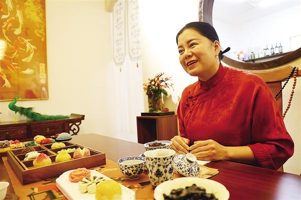 店内陈列的糕点,宛如一件件精妙的艺术品。饱满的花生、核桃,鲜艳的寿桃、黄梨……近30种造型的糕点,均由陈丽手工制作。她的一双巧手为糕点注入了灵魂和艺术内涵。