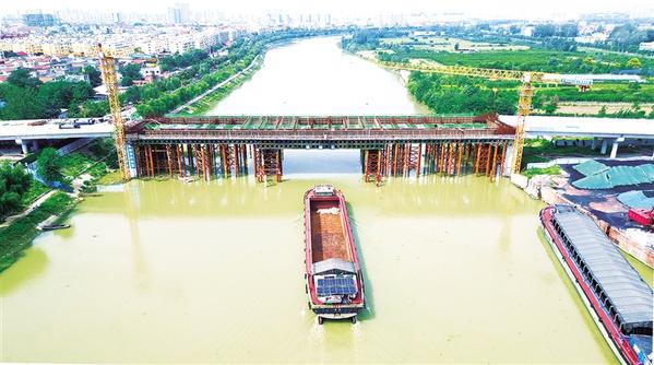 9月16日上午,建设中的项城通济大道桥卧波于沙颍河之上,货船从30米宽的通航孔缓缓驰过,保障豫货出海。在建的通济大道桥是沙颍河周口至省界航道提升工程之一,该桥全长534.5米,其中跨沙颍河主桥长130米,为单孔双向航道设计。从2024年动工以来,两端引桥主体已经完工,130米的主桥即将进入混凝土浇筑。该桥计划于2026年3月底建成通车。记者 梁照曾 摄