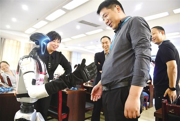 活动现场,智能机器人向参会代表介绍助企政策。记者 梁照曾 摄