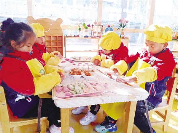 太康县实验幼儿园的小朋友在食育工作坊包饺子。