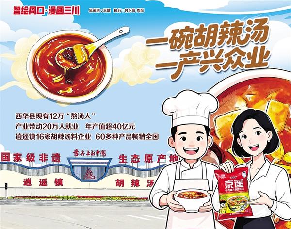 西华县逍遥胡辣汤风味独特,以本地优质小麦粉、黄花菜、槐山羊肉为主要食材,配以二十余种香料,汤味香辣浓郁。当地通过成立产业发展中心、制定行业标准等措施,着力推动胡辣汤产业向标准化、品牌化、国际化发展。该县目前拥有约12万从业人员,产业带动就业20万人,年产值突破40亿元。作为产业核心区的逍遥镇,已集聚16家胡辣汤调料生产企业,产品种类达60余种,畅销全国。记者 付永奇 周彦 文/图