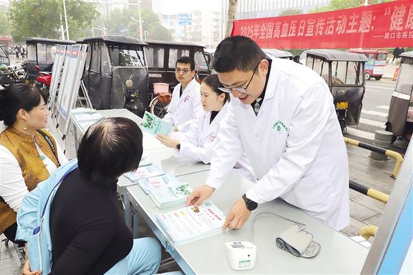 本报讯 2025年10月8日是第28个“全国高血压日”,宣传主题是“健康体重,理想血压”。当日,周口市疾控中心在人民路社区卫生服务中心门前开展健康宣传和科普活动,吸引众多市民参与。