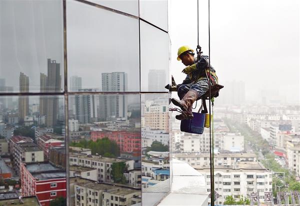 近日,一名“蜘蛛人”在中心城区一座大楼的外墙面认真作业,为城市的美丽和整洁贡献着自己的力量。 段继军 摄