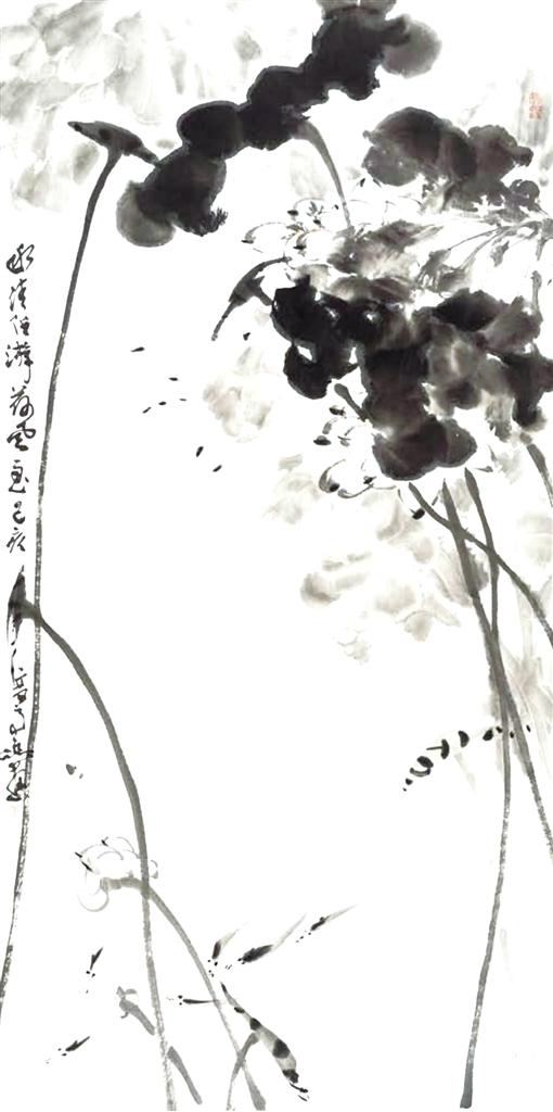 落笔有神,水墨交融,古艳清雅,彰显时代气息,艺无止境。我的荷花设色追求清新雅致之境,故宜在古雅与清新之间找到平衡。红花墨叶与白莲映衬,色不掩墨,墨衬花雅,黑而不滞,艳而不俗,即呈“古艳”,遂成传递当代人渴望的“一方净土”。