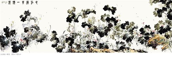 追寻苍茫古拙之美,追逐海派精神风骨。多少年来,我以缶翁吴昌硕的浑厚朴拙为神游,以书入画,体悟吴昌硕的金石之气和天真烂漫。我亦醉心于潘天寿先生“强其骨”和“一味霸悍”的艺术特质之中,在两位大师的艺术殿堂里痴迷遨游,不求形似,但求意到、情真、味儿足。然而,能得其三昧真火,亦若赤子之追梦也。潘天寿的泼墨荷花往往是放笔直取,大胆落墨,精心穿插,画面构成奇逸雅致。他善用大块面的墨叶完成画面的体势和章法的摆布,以意笔线条穿插极简构成硕大的石块。尤其是潘天寿先生疏密有致的构图和别致的造型,促使我醉心追求“以少少许胜多多许”的极简极雅境界。