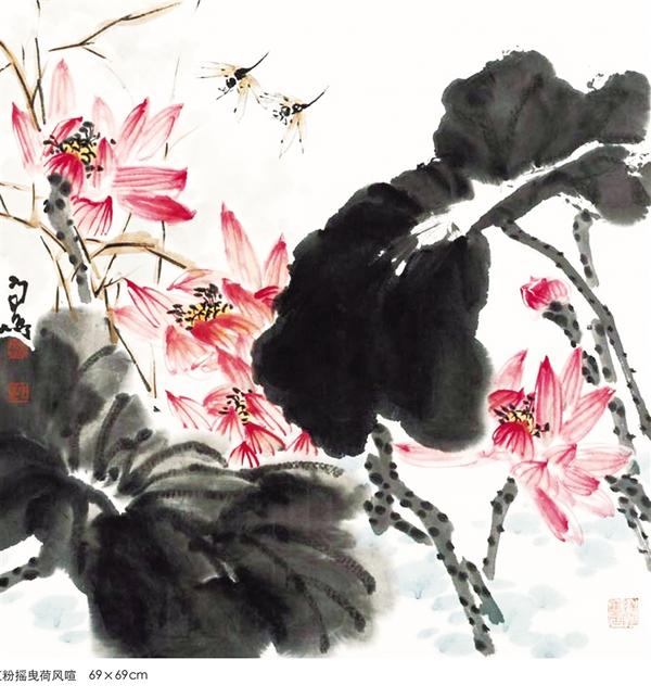 书画者的“心、手、眼”是一个连贯的过程,应善于吸收中国画以外的艺术表现形式,包括西方现代视知觉,国外油画的色彩、构成,摄影的色光感知等。我把“疏可走马、密不透风”与现代构成作对比,相信“艺术来源于真实”,但又不拒绝文人画“清冷避世”的旧调,并坚信艺术是高度的概括和思想意念的升华。中国画既非具象亦非抽象,它是意象的,所以叫写意。“旧瓶装新酒”,用传统写意手法让荷花呈现出生活的韵致,传达当代气息与市井生活渴望的“精神栖居”意象。