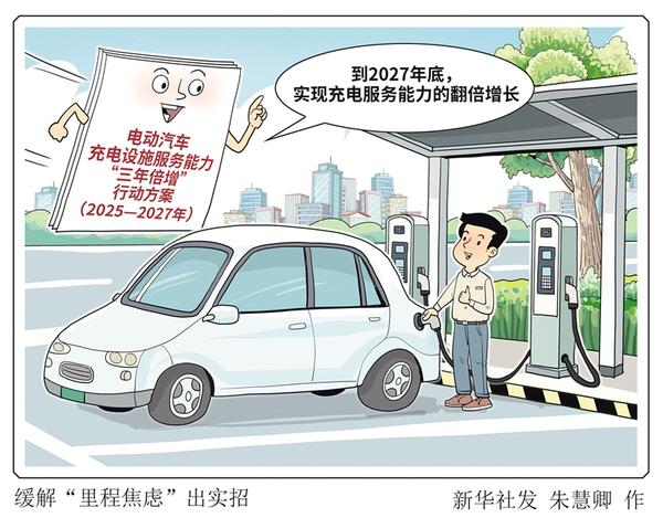 2025年10月17日 缓解“里程焦虑”出实招。国家发展改革委、国家能源局等部门近日印发《电动汽车充电设施服务能力“三年倍增”行动方案(2025—2027年)》,明确到2027年底,实现充电服务能力的翻倍增长。 新华社发 朱慧卿 作