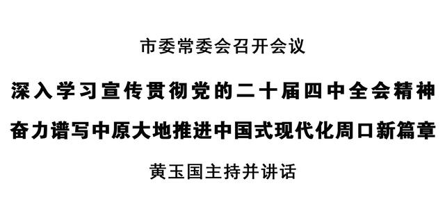 会议认为,党的二十届四中全会是在向第二个百年奋斗目标进军的新征程上举行的一次十分重要的会议。习近平总书记所作的工作报告、对《建议》稿的说明和重要讲话,集中展示了党的二十届三中全会以来以习近平同志为核心的党中央团结带领全党全国各族人民勇毅前行、开拓创新取得的新成就,深刻阐明了“十五五”规划建议起草的主要考虑和《建议》基本内容,科学回答了关系党和国家事业发展的一系列重大理论和实践问题,是党的创新理论的最新成果。全会审议通过的《建议》,系统总结“十四五”时期我国发展取得的重大成就,准确把握“十五五”时期党和国家事业发展所处历史方位,对未来五年发展作出顶层设计和战略擘画,是指导全面建设社会主义现代化国家的纲领性文件。要深刻领悟“两个确立”的决定性意义,坚决做到“两个维护”,引导广大党员干部把思想和行动统一到全会精神上来,推动党中央决策部署在周口落细落实、见行见效。