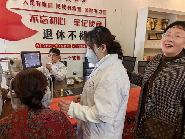 活动现场设置视力检测区、眼底筛查区等功能区域,医护人员为老同志进行全面眼部健康检查和评估,重点筛查白内障、青光眼等老年高发眼病,并现场为老同志讲解有关眼健康防护知识。针对检测中发现的疑似白内障患者及其他眼疾者,医护团队现场建立健康档案并预约复诊通道,使受检者有所医、有所治,彰显人文关怀。