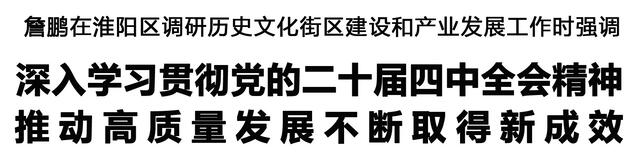 本报讯 (记者 李凤霞 何晴) 10月29日,市长詹鹏到淮阳区调研历史文化街区建设和产业发展工作,强调要深入学习贯彻党的二十届四中全会精神,扎实推进产业高质量发展,巩固壮大实体经济根基,奋力谱写中原大地推进中国式现代化周口新篇章。张建党、王文峰参加调研。