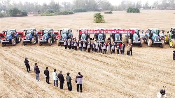 与广场相邻的田地里,13台高大的农机整齐列阵,一群年轻人正在此举行“周口农服2025年度小麦单产提升暨高产创建启动仪式”。