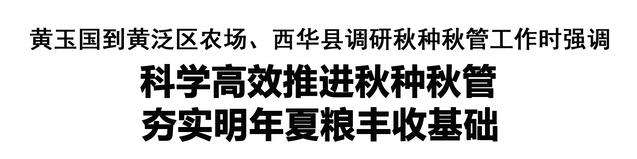 本报讯 (记者 王艳) 11月11日,市委书记黄玉国到黄泛区农场、西华县调研秋种秋管工作。他强调,要深入学习贯彻习近平总书记关于“三农”工作的重要论述和在河南考察时重要讲话精神,坚决扛稳扛牢粮食安全责任,科学高效推进秋种和田间管理,确保种足种好小麦,为明年夏粮丰收奠定坚实基础。