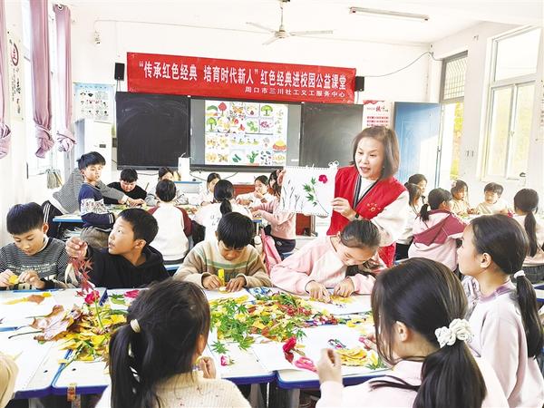 11月11日,周口市第十七初级中学小学部四(1)班教室里欢声笑语不断,一场由周口市三川社工义工服务中心精心策划的“树叶变变变”创意手工画活动在这里举行。活动中,孩子们化身“小小艺术家”,把秋天装进了画框里。记者 窦娜 摄