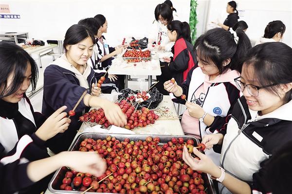 劳动课上,学生在串山楂。