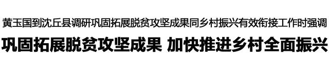 本报讯 (记者 王艳 王晨) 11月18日,市委书记黄玉国到沈丘县调研巩固拓展脱贫攻坚成果同乡村振兴有效衔接工作,强调要深入学习贯彻党的二十届四中全会精神和习近平总书记在河南考察时重要讲话精神,全面落实省委和市委部署要求,扛牢责任、真抓实干,毫不松懈巩固拓展脱贫攻坚成果,加快推进乡村全面振兴,牢牢守住不发生规模性返贫致贫底线。