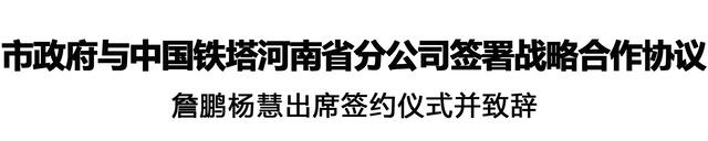 本报讯 (记者 李凤霞) 11月18日,周口市人民政府与中国铁塔河南省分公司签署战略合作协议。市长詹鹏,中国铁塔河南省分公司党委书记、总经理杨慧出席签约仪式并致辞。中国铁塔河南省分公司副总经理代沛、副市长梁建松代表双方签署战略合作协议。市政府秘书长王文峰出席。