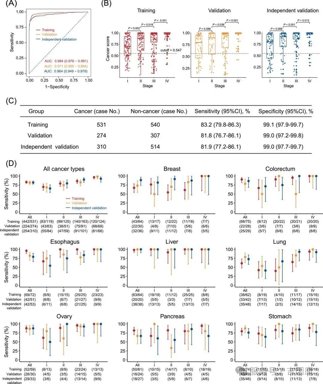 在独立验证中,该方法整体特异性高达 99.0%(意味着很少出现假阳性),整体灵敏度达 81.9%(意味着能准确检出大部分癌症),有效平衡“漏诊”与“误判”风险。对早期癌症的检测能力尤为突出,Ⅰ 期癌症灵敏度达 65.5%,Ⅰ-Ⅱ 期综合灵敏度达 71.3%。不同癌症类型的总敏感性如下:食管癌(79.2%)、胃癌(76.1%)、结直肠癌(86.2%)、胰腺癌(66.7%)、肝癌(100.0%)、肺癌(72.9%)、乳腺癌(88.9%)和卵巢癌(87.9%)。对于尚缺乏标准筛查方案的卵巢癌和胰腺癌,为其筛查提供了可靠的新型方案。