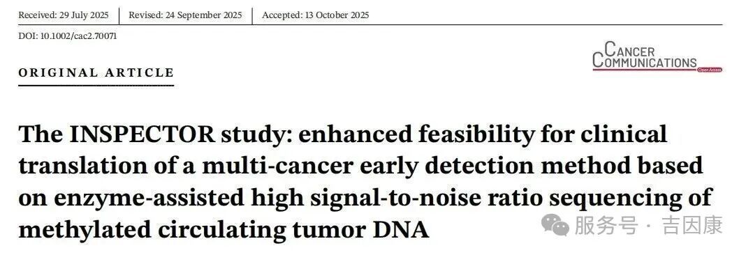近日,中山大学肿瘤防治中心与吉因加联合研发了一种新型液体活检多癌筛查(MCED)和癌症信号溯源(CSO)方法,其成果《The INSPECTOR study: enhanced feasibility for clinical translation of a multi-cancer early detection method based on enzyme-assisted high signal-to-noise ratio sequencing of methylated circulating tumor DNA》在国际著名杂志、Science合作期刊Cancer Communications(IF=24.9)上在线发表。