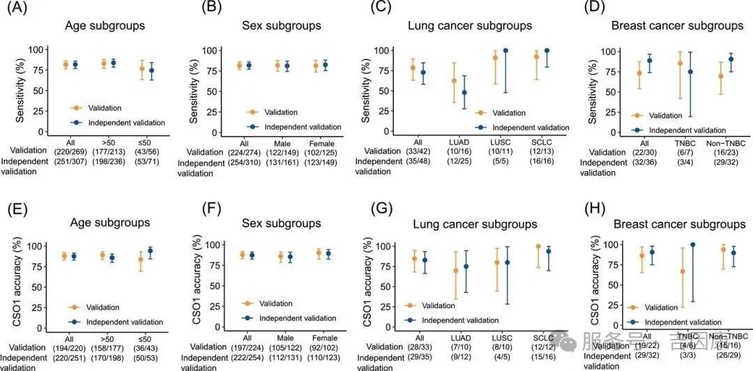 本研究对验证集和独立验证集的亚组(年龄、性别、组织病理学亚型)进行了更细致的分析,评估了MCED和CSO在不同亚组之间的灵敏度与溯源准确率。