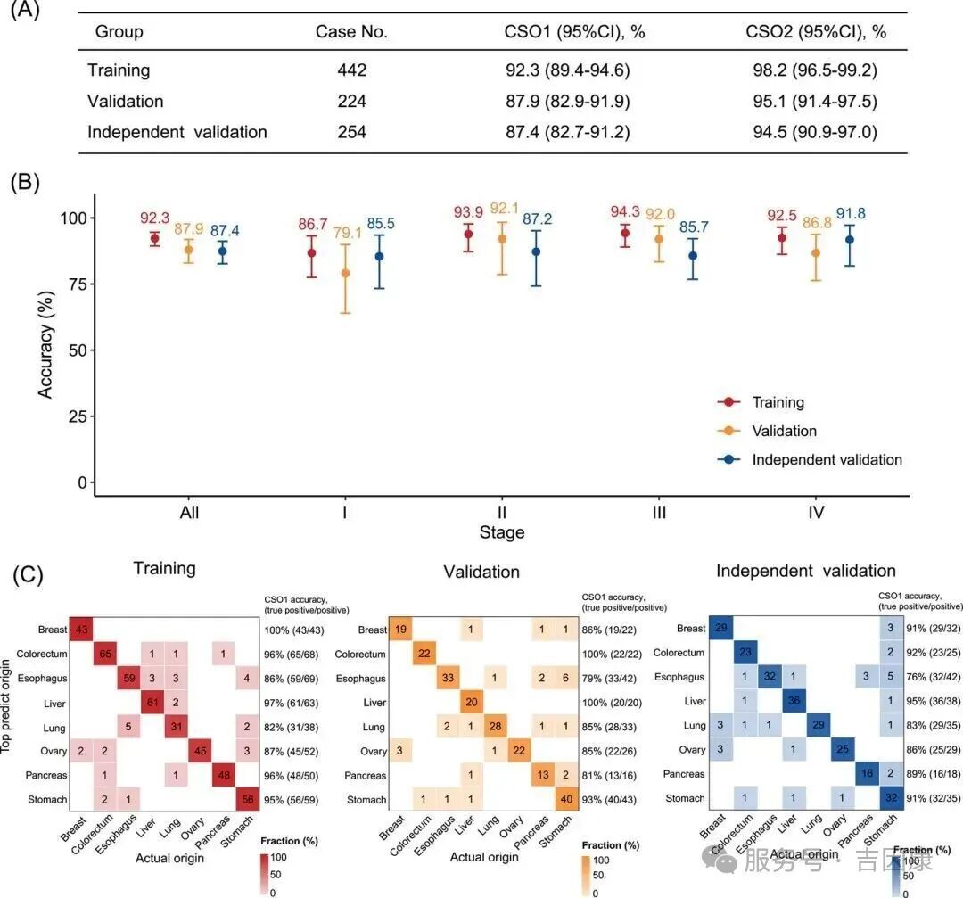 CSO模型也表现出优异的肿瘤溯源性能。在独立验证队列中,Top1(首推)原发灶预测准确度达87.4%,Top2(前两位)原发灶预测准确度更高达94.5%;即使对信号更微弱的早期肿瘤,Ⅰ期癌症Top1原发灶预测准确度仍保持85.5%,Ⅰ-Ⅲ期准确度稳定在85%-87%。精准的病灶定位能力,可避免 “检出癌症却找不到原发灶” 的临床困境,为后续针对性诊疗方案制定提供关键依据。