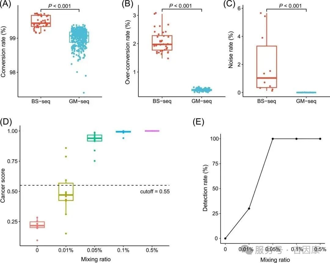 通过最低检测限(LoD)测试,GM-seq平台下的MCED模型在0.01%混合梯度下检出率可达到30%,在0.05%及以上混合梯度下检出率可达到100%。