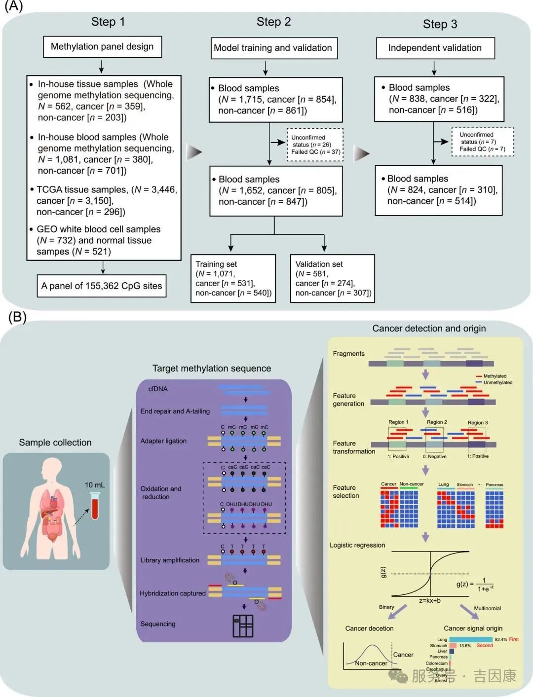 研究团队整合了 6342 例样本数据,最终筛选出包含 15.5 万个 CpG 位点的检测组合,精准覆盖 8 种中国高发癌症(精准覆盖肺癌、乳腺癌、结直肠癌、肝癌、食管癌、胃癌、胰腺癌、卵巢癌),更贴合国人的癌症发病特点。依托该标志物组合建立靶向捕获的GM-seq深度测序体系,开展多中心队列研究,开发的多癌种早筛(MCED)模型与癌症信号溯源(CSO)模型,同步实现8 种癌症早期异常信号的检测与原发灶定位。