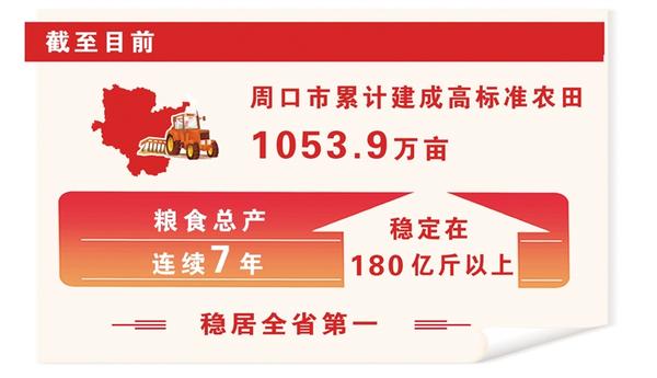 市委农办副主任,市农业农村局党组成员、副局长杨朝晖介绍,截至目前,全市累计建成高标准农田1053.9万亩,粮食总产连续7年稳定在180亿斤以上,稳居全省第一。肉蛋奶、蔬菜产量持续领跑全省。多个全国、全省会议在我市召开,“周口经验”在全省、全国得到推广。