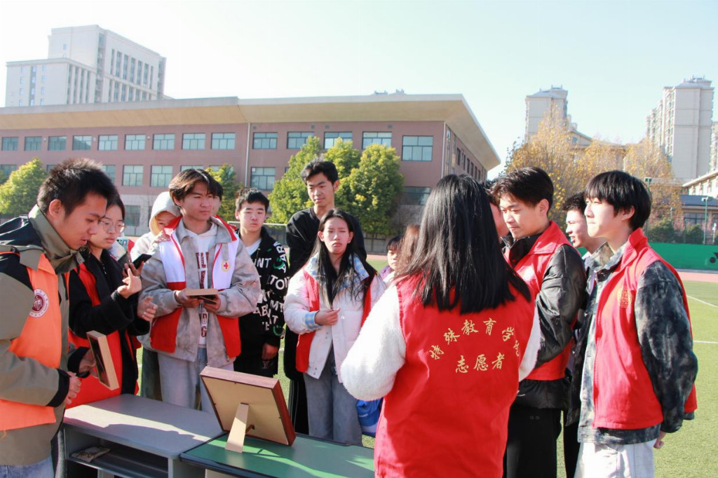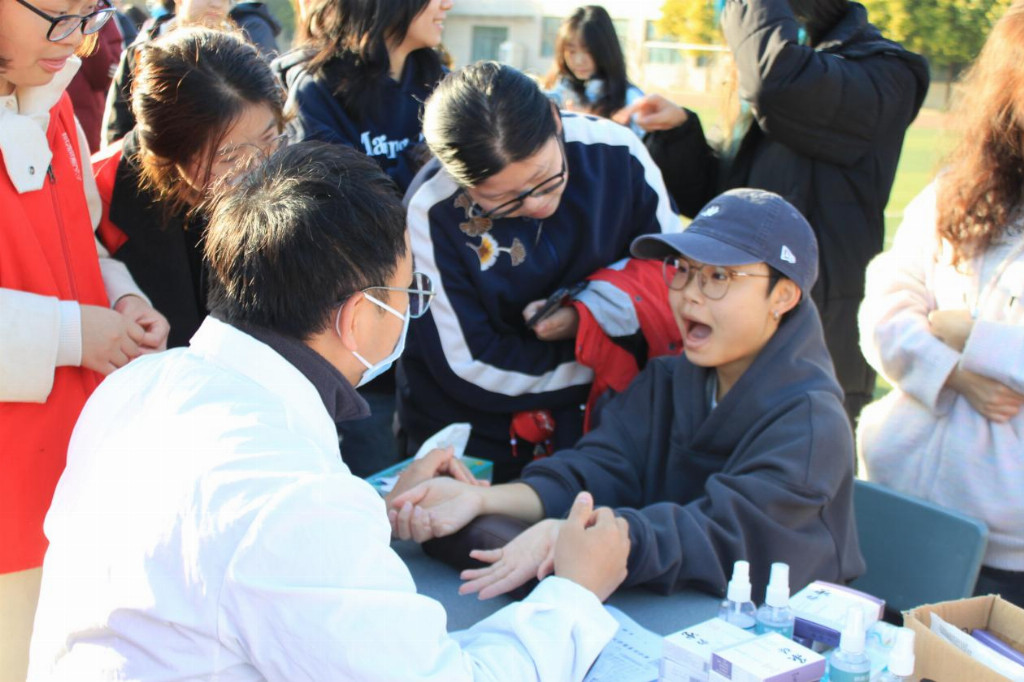 “望闻问切”间筑牢健康防线。义诊区里,中医学博士代民涛、韩亚洲耐心为每一位听障学生辨证施治,细致开展望闻问切,精准开具个性化健康处方,针对常见的颈肩不适、睡眠不佳等问题提供针灸治疗建议。志愿者徐灿、王姗姗、杨莹莹等则有序为同学们测量血压、检测血糖,细致讲解体质辨识知识,用专业与耐心为学生健康保驾护航。“扎针时酸酸胀胀的,扎完后全身舒畅。”一位接受针灸体验的听障学生通过手语向志愿者表达了内心的感受。