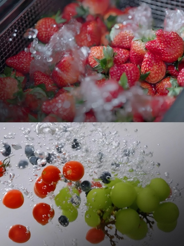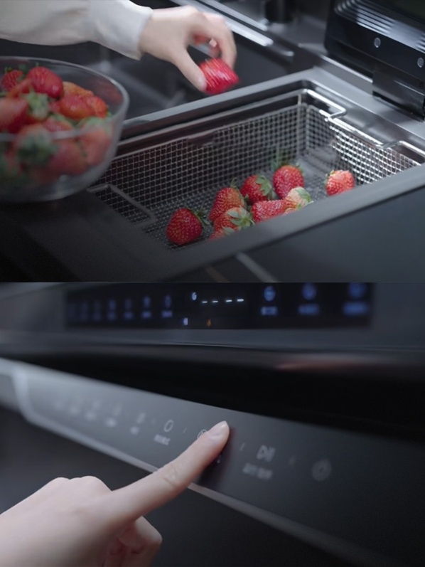 得益于集成式设计,火星人D75集成洗碗机还自带了一个果蔬净洗系统。它利用高速水流冲击碰撞产生的气泡来剥离表面油污,不涉及化学洗涤剂,也不会破坏食材原本的口感与营养,比传统手搓模式效果更好,也比各类果蔬清洗剂来的更加适口安心。在操作上,这台洗碗机的所有功能都集成在触控面板上,界面非常简洁,操作也格外直观,老人小孩都能轻松使用。