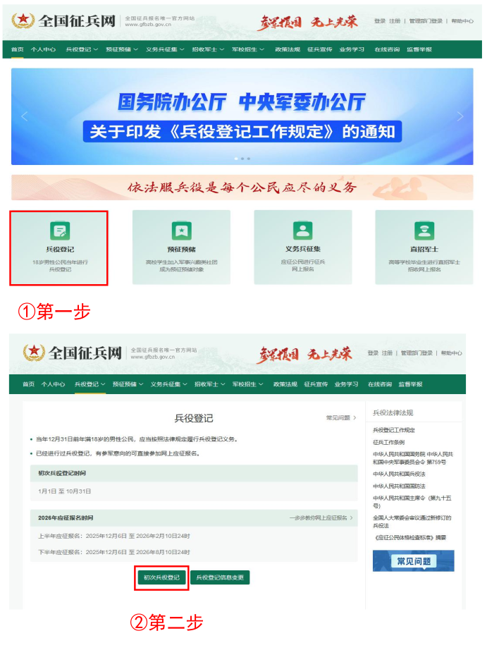 全国征兵网登记。登录“全国征兵网”(网址:http://www.gfbzb.gov.cn)点击进入“兵役登记”。