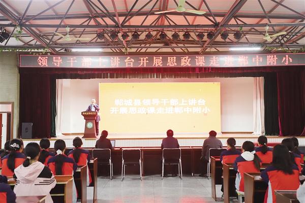 郸城县人民法院党组书记、院长张建援(台上)在郸城中学附属小学讲授思政课。