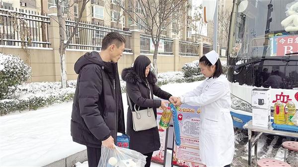 1月19日,热心市民冒雪步行到献血车无偿献血,以热血守护生命。图为市民献血后领取无偿献血纪念品。