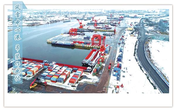1月21日上午,白雪装点下的周口中心港范营作业区一片繁忙景象。码头上,运输车辆往来穿梭,集装箱吊装作业有序进行,呈现了新年伊始港口生产的蓬勃气象。记者 梁照曾 摄影