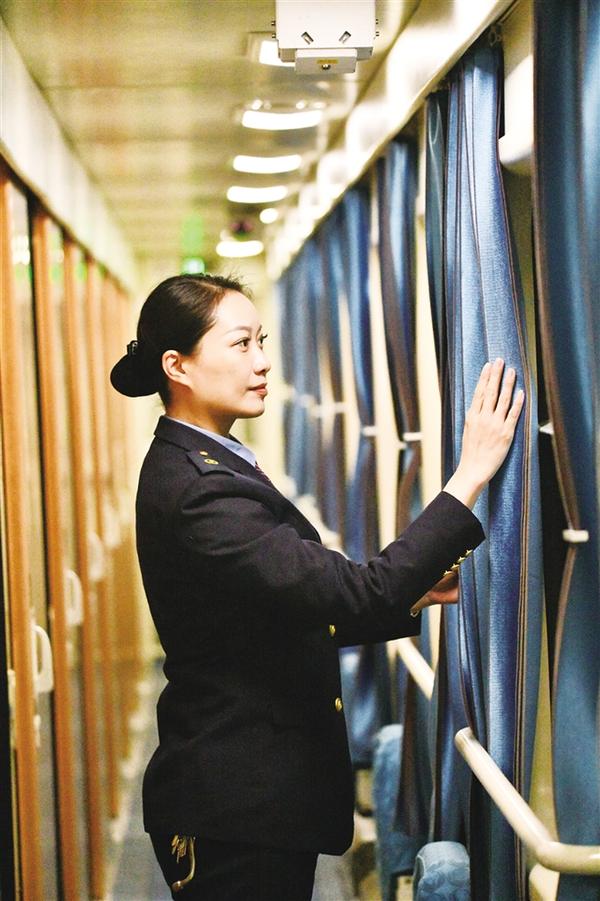 乘务员在整理列车窗帘。