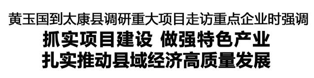 调研中,黄玉国听取太康县项目建设、招商引资等重点工作情况汇报,强调要坚持稳中求进,进一步认清形势,增强压力感、紧迫感和责任感,全力扭转经济增长乏力局面。要抓紧抓实项目建设,真正把工作重心和精力放在抓项目上,坚持向政策要机遇、向市场要项目,保证数量、做实项目、提升效益,算好投入产出账,以高质量项目支撑县域经济高质量发展。要努力提升城乡面貌,用心用力加强城市建设管理,持续推进农村人居环境整治,做优商贸服务业,激活城乡发展活力。要振奋精神、强力作为、狠抓落实,领导干部要带头树立和践行正确政绩观,敢担当、作表率,坚定发展信心,勇于攻坚克难,健全工作机制,鼓励担当作为,以新气象新作为推动各项工作取得新成效。