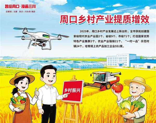 2025年,周口乡村产业发展迈上新台阶,全市获批创建国家级现代农业产业园2个、省级9个、市级71个,形成“国家级引领、省级支撑、市县级补充”的梯次发展格局。打造国家优势特色产业集群2个、农业产业强镇21个、“一村一品”示范村镇24个,培育规上农产品加工企业551家,形成以益海粮油、金丹乳酸、雪荣面粉为龙头的粮食加工产业集群。记者 付永奇 周彦 文/图