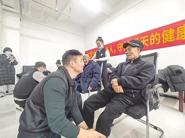 3月7日,志愿者在帮老人按摩。当日,市中小企业商会联合爱心人士来到川汇区中心敬老院开展以“关爱老人·传递温暖”为主题的公益慰问活动。志愿者不仅和老人拉家常、为老人按摩,还为他们带来了米、面、油和医用口罩等物品。记者 杜林波 摄