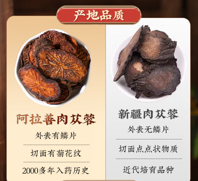 很多消费者不知道,肉苁蓉分为“营养期”和“生殖期”。天津中医药大学的研究明确指出,未抽薹(营养期)的药材为优质品,其特征是体质量、质柔韧、鳞片密;而抽薹(开花后)的药材为次等品,体轻、质硬、断面常有裂隙。