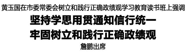 黄玉国领学了《习近平关于树立和践行正确政绩观论述摘编》中“政绩观问题是一个根本性问题”篇章。詹鹏领学了《习近平总书记地方工作期间坚持正确政绩观生动实践》中“河北正定篇”“福建篇”。市委常委作交流发言。