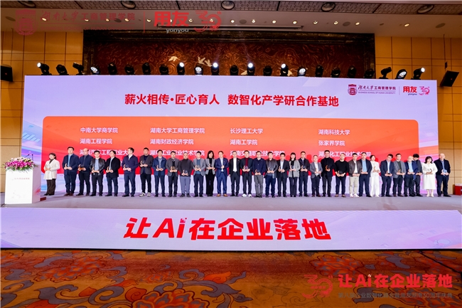 3月26日,在湖南省工信厅、湖南省国资委指导下,由用友联合湖南大学工商管理学院共同主办,湖南大学工商管理学院EE中心、长沙市企业服务中心、中国农业银行股份有限公司长沙分行、新道科技股份有限公司、北京用友政务软件股份有限公司、畅捷通信息技术股份有限公司协办的“让AI在企业落地”第八届企业数智化峰会在湖南长沙隆重召开。会上,用友新道联合16所院校共建的2026 年(湖南)数智化产学研合作创新基地正式启动,用友网络董事长兼CEO王文京为基地院校授牌,开启湘域数智化产教融合新征程。
