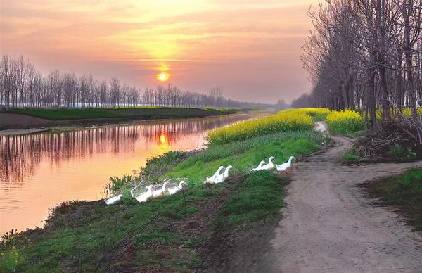 落日熔金,为沙颍河镀上一层暖橙柔光。澄澈河水倒映着天际晚霞与岸旁疏林,漾起粼粼金波。田埂旁油菜花盛放,明黄灿烂。一群白鸭悠然踱过青草地,将春日乡野的宁静与生机,晕染成一幅温柔治愈的暮春晚景图。李方海 摄影