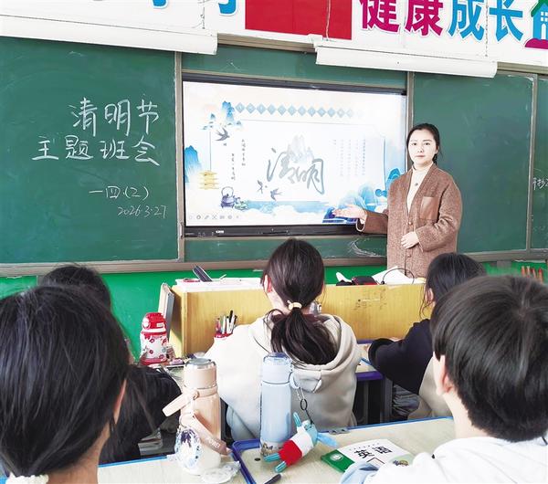 商水县新城小学四(2)班开展清明节主题班会。近日,商水县新城小学举行“清明祭英烈,传承爱国心”主题教育活动。全校师生通过主题班会、网上祭奠、陵园祭扫等形式,缅怀革命先烈,在仪式与实践中传承红色基因,厚植爱国情怀。记者 马治卫 摄
